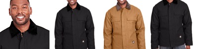 10 oz., heavy-duty cotton duck; Heavyweight quilt-lined taffeta; Water-repellent finish; Full-cut arm openings for maximum comfort; Extra large front patch pockets; Three inside pockets; Extended back for extra warmth;