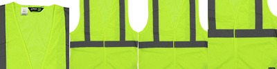 4 oz., polyester mesh; 2" reflective tape; ANSI/ISEA 107-2015 Type R Class 2 Certified; Hook/loop front closure; Adjustable snaps on side seam; Banded armholes, neck opening, and waist;