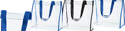 PVC; Clear PVC body; Contrasting binding; Contrasting drawstring straps; 13"W x 16"H ; Requires California Prop 65 Warning Label;