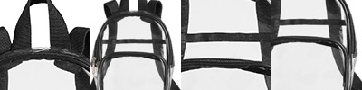 PVC; Clear PVC body; Contrasting binding; Front zipper pocket; Side mesh pocket; Padded adjustable straps; 12"W x 15 1/4" H x 4"D ; Requires California Prop 65 Warning Label;