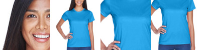 4 oz., 100% micro-polyester; Moisture-wicking; UPF 30+ protection; Feminine fit; Double-needle sleeves and bottom hem; Open cuffs; Transitioning from heat-seal label to tear away label. Inventory may be mixed;