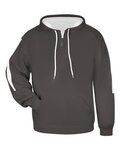 7.25 oz. 60% cotton, 40% polyester melange fleece; Scuba hood; Contrast drawcords; Front pouch pocket; Rib waist & cuffs; Two contrast stripes on each sleeve;
