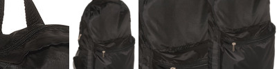 - Features zipper pocket at both sides ( 9"w x 13"h), note left side pocket expands into main compartment for storage of shoes