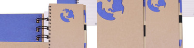 - Recycled hard cover wire-bound notebook with die cut global (earth-shape) cover design.