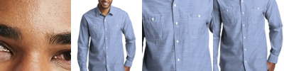 Washed chambray and off-white contrast stitching give this casual garment washed shirt an authentic, laid-back look.