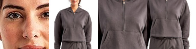 8 oz./yd²., 60/40 cotton/recycled polyester Heather Grey: 90/10 cotton/viscose Cropped, oversized fit Double-panel hood Half-zip fastening to front Pouch pocket Thumbhole on cuffs Paneling detail on back Tear away label Recycled polyester from post-consumer plastic