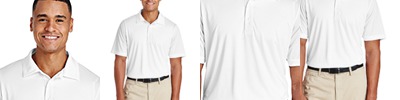 3.5 oz./yd2 / 130 gsm, 100% polyester interlock; Moisture-wicking and UV protection performance; Dyed-to-match buttons; Team fit; Three-button placket; Cationic dyes for superior brightness and excellent colorfastness; Transitioning from heat-seal label to tear away label. Inventory may be mixed;