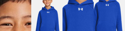 - UA woven label centered on left sleeve hem and UA heat seal center back neck